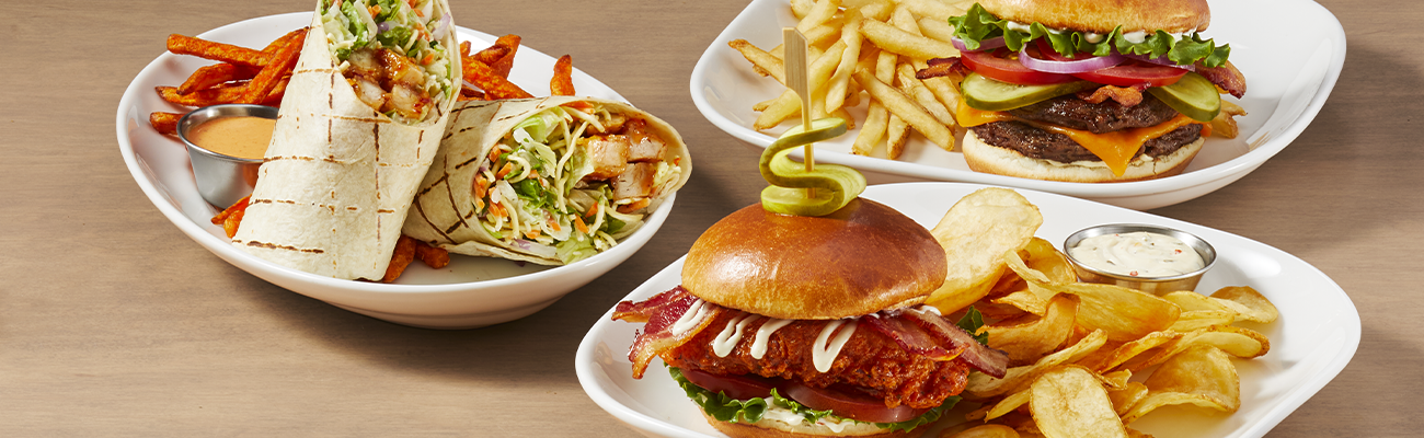Two-grilled quarter-pound patties, topped with cheddar, lettuce, tomatoes, red onions, pickles, and our signature cactus dip, on a brioche bun.