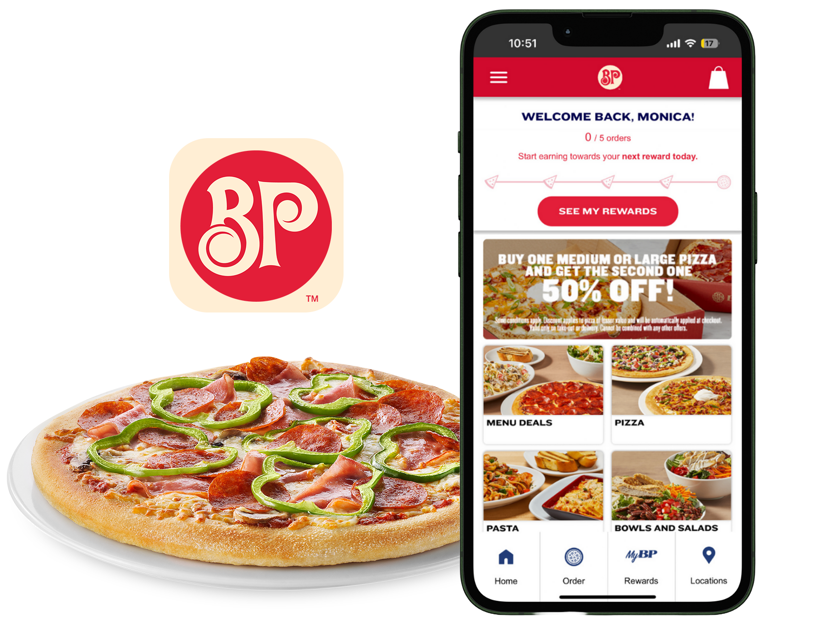 You read that right! As a MyBP member, every online or mobile app order brings you closer to a mouth-watering 50% off your pizza after your 5th online order. Plus, with our NEW order tracker, keeping tabs on your reward status has never been easier.