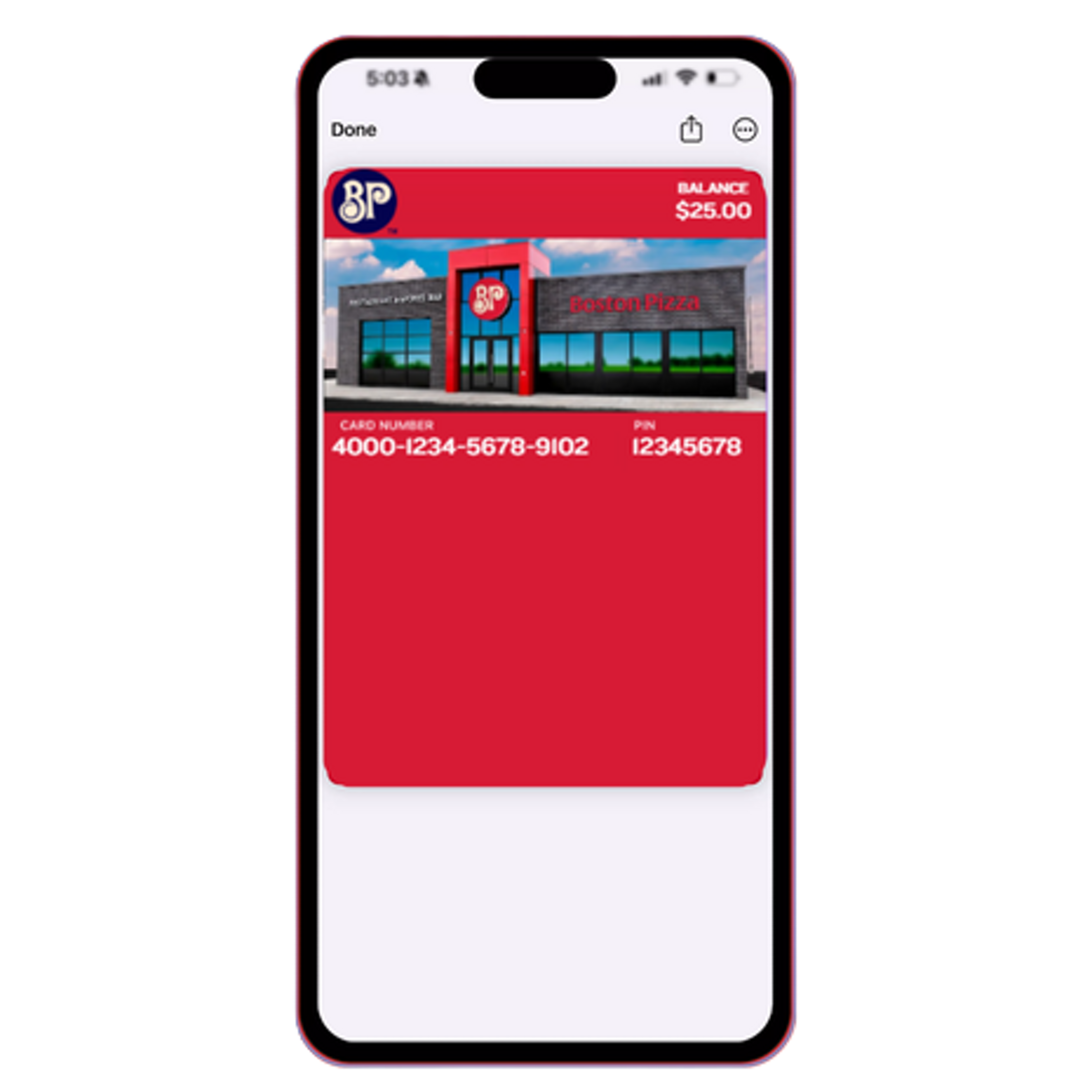 Boston Pizza. - Les cartes-cadeaux en plastique et cybercartes-cadeaux peuvent être achetées sur le bostonpizza.com.