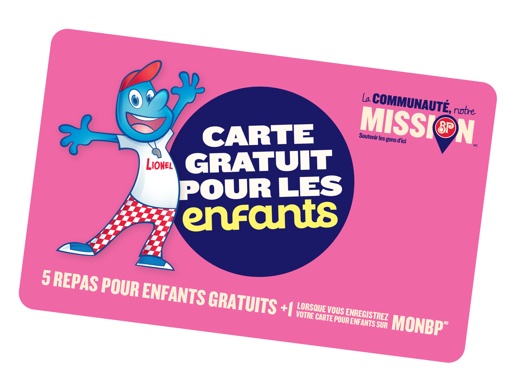 Un repas supplémentaire sera ajouté à toute carte enregistrée à un compte MonBP valide. Un (1) repas pour enfants par carte sera ajouté automatiquement lorsque la carte est enregistrée. Toutes les modalités et conditions, ainsi que les minimums d'achats et les exclusions de la carte pour enfants s'appliquent. Aucune valeur monétaire. Le prix inclut toutes les taxes applicables aux repas pour enfants. Taxes sur les ajouts aux repas pour enfants en sus. L'offre prend fin le 30 juin 2026.