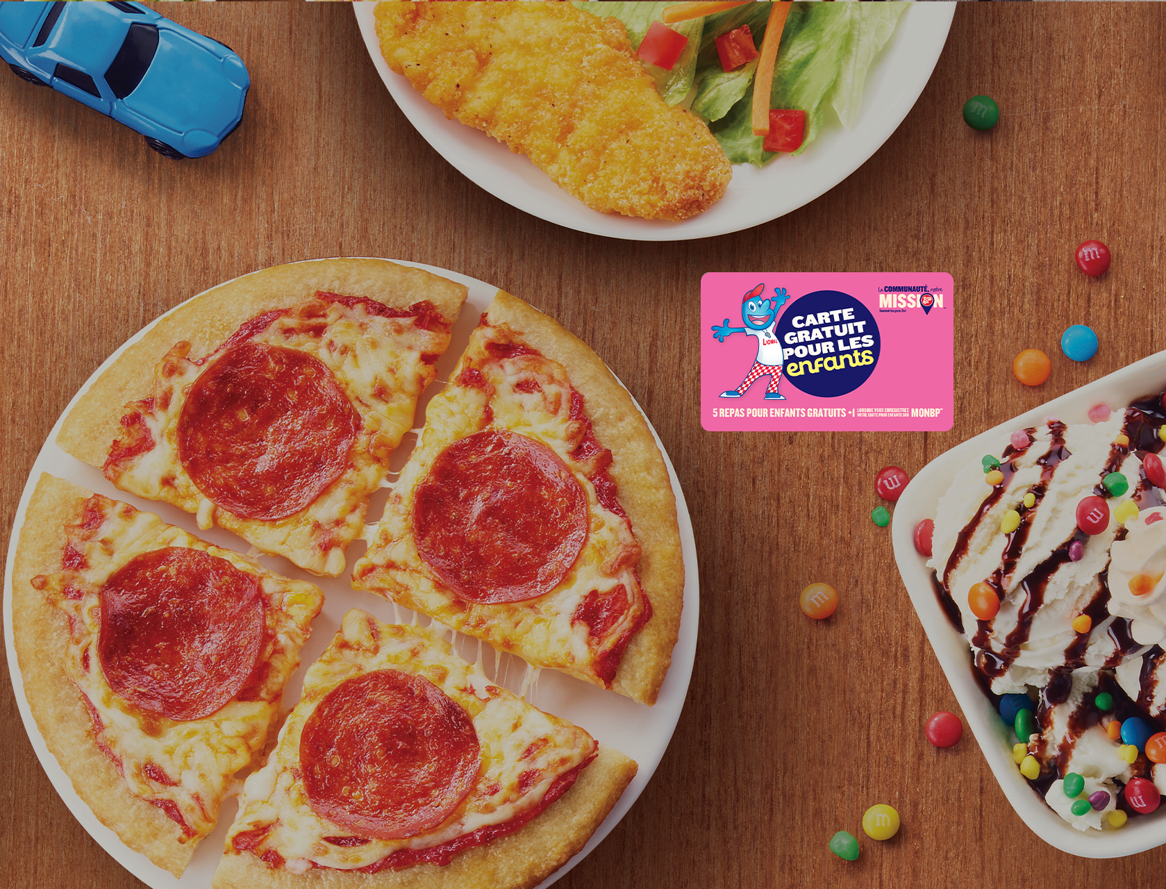 Pour chaque repas pour enfants contenu sur la carte pour enfants, obtenez un (1) repas pour enfant à 9,49 $ GRATUIT avec un achat minimum de 16 $ (excluant les taxes et les pourboires). Au Québec, vous obtenez un (1) repas pour enfant à 7,49 $ GRATUIT avec un achat minimum de 16 $ (excluant les taxes et les pourboires). Valable en restaurant seulement. Des frais supplémentaires s’appliquent pour tout ajout aux repas pour enfants, les repas pour grands appétits et les plats principaux à 10,49 $ (au Québec). Ne peut être combinée à aucun autre coupon ni aucune autre offre promotionnelle. La carte expire le 30 juin 2026. Veuillez présenter la carte ou le numéro de la carte avant de commander. Aucune valeur monétaire. Le prix inclut toutes les taxes applicables.